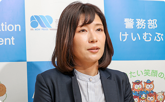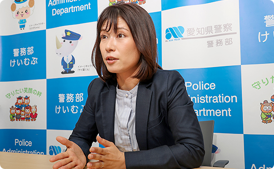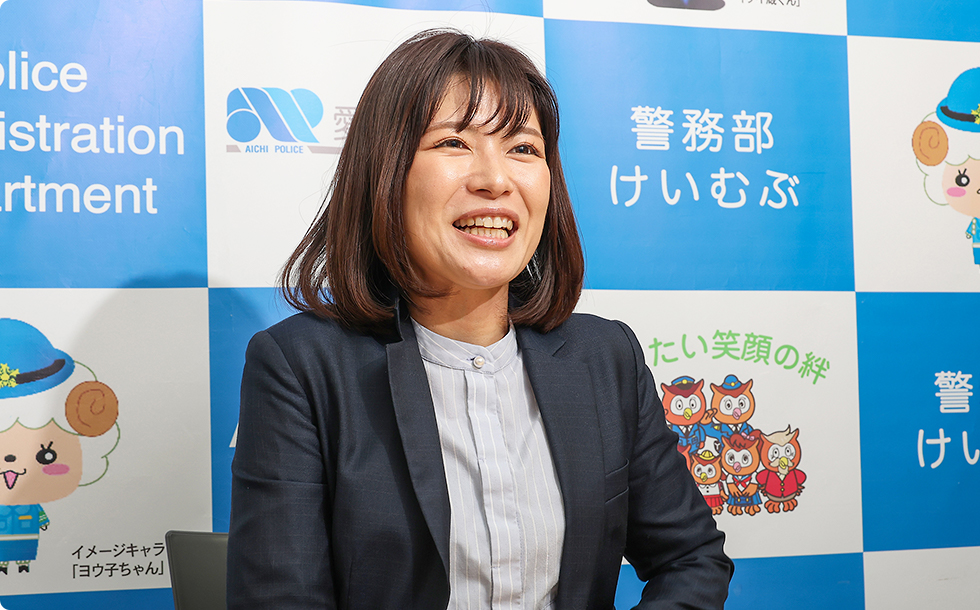 愛知県警は規模が大きく、業務の幅が広いのが特長です。私も、交番勤務、音楽隊、採用係、各種事件捜査や防犯対策など、多様な経験をさせてもらいました。男女を問わず、自分の希望や特性に応じたフィールドに挑戦できる環境があります。